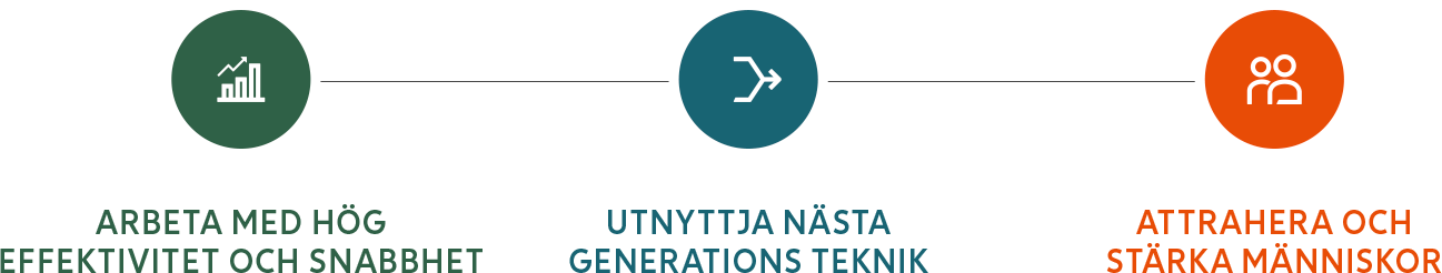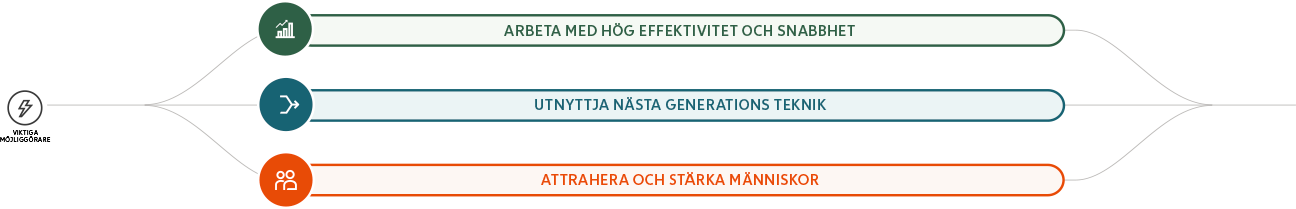 Effektivisering, nya teknologier och våra medarbetare är nödvändiga områden att prestera inom för att kunna realisera vår ambition. Därför måste vi utmärka oss genom att: